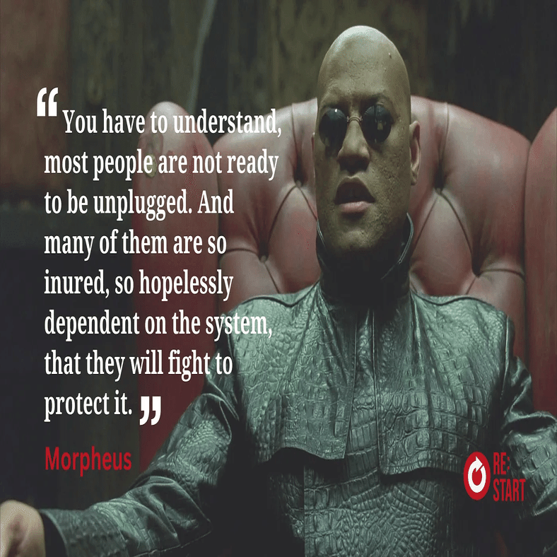 モーフィアスが確立されたシステムからの離脱に対する恐怖や抵抗を説明するように、